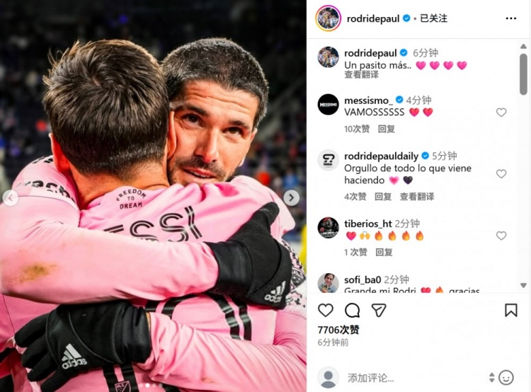 本场比赛梅西贡献1球3助攻,德保罗也在社媒晒出与梅西拥抱合影,配文:“再进一步