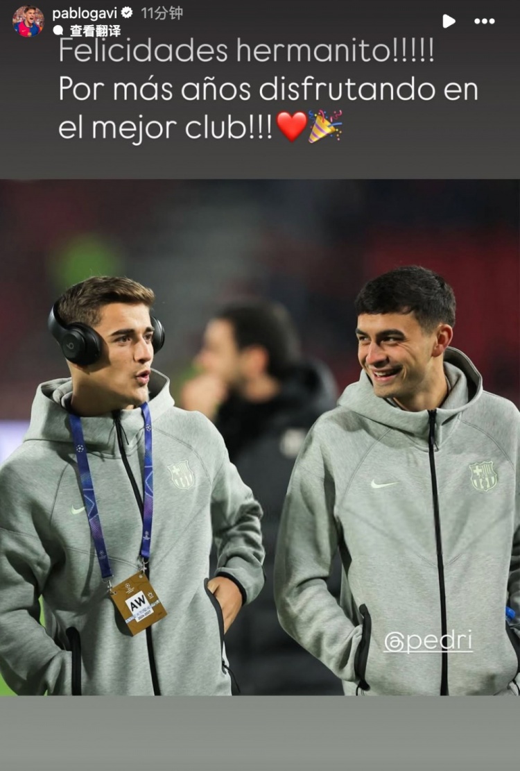 直播吧11月25日讯 今天是巴萨中场佩德里的23岁生日,他的好兄弟加维通过社媒为其送上祝福。