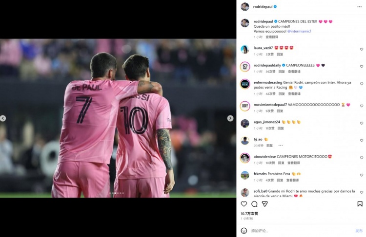 德保罗赛后在个人社媒晒出与梅西庆祝合影,配文写道:“东部冠军!只剩最后一步,让我们一起加油!”