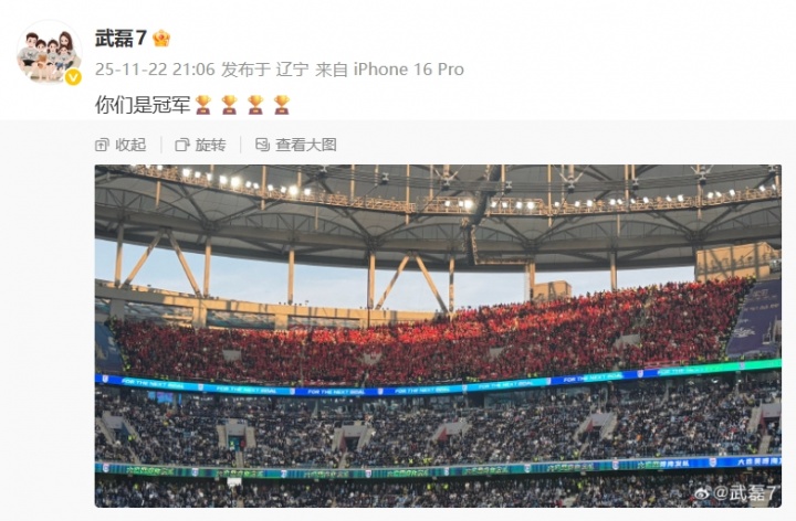 武磊晒出了末轮随海港远征客场的球迷角,并且配文:“你们是冠军